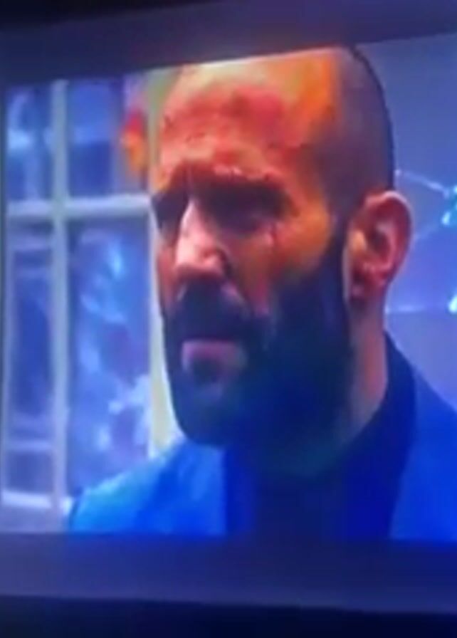 television screen playing a scene from a movie or show. Initially, a man with dark hair and a beard, wearing a yellow jacket, is shown in a close-up. The text "You're just a man" is displayed on the screen. The camera then shifts to another man, bald with a beard, wearing a blue suit, who responds with "I know." The scene broadens to reveal both men standing in a brightly lit hallway with white walls and large windows, which are visible in the background. The man in the yellow jacket then walks towards the man in the blue suit. The camera then moves to be behind the man in the blue suit, obscuring his face, as the man in the yellow jacket continues to move closer.