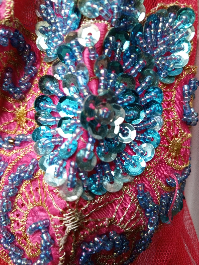 - "A close-up shows vibrant pink fabric elaborately decorated with light blue beads and sequins" by FM-J9COi1, licensed under CC BY 4.0