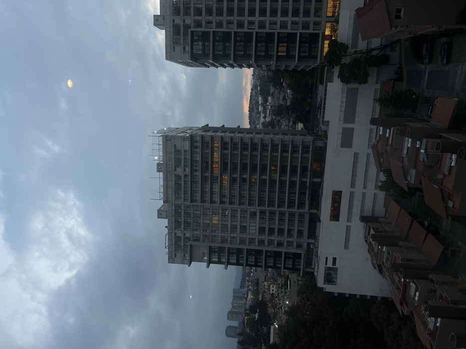 The image depicts a cityscape at dusk with a cloudy sky. Two tall, modern apartment buildings stand prominently, their windows reflecting dim light. Between them, a glimpse of orange sunset illuminates the horizon over a sprawling urban area. Adjacent to one building, a lower structure with a white facade complements rows of red-roofed townhouses. A crescent moon is visible in the cloudy sky, and streetlights dot the distant landscape.
