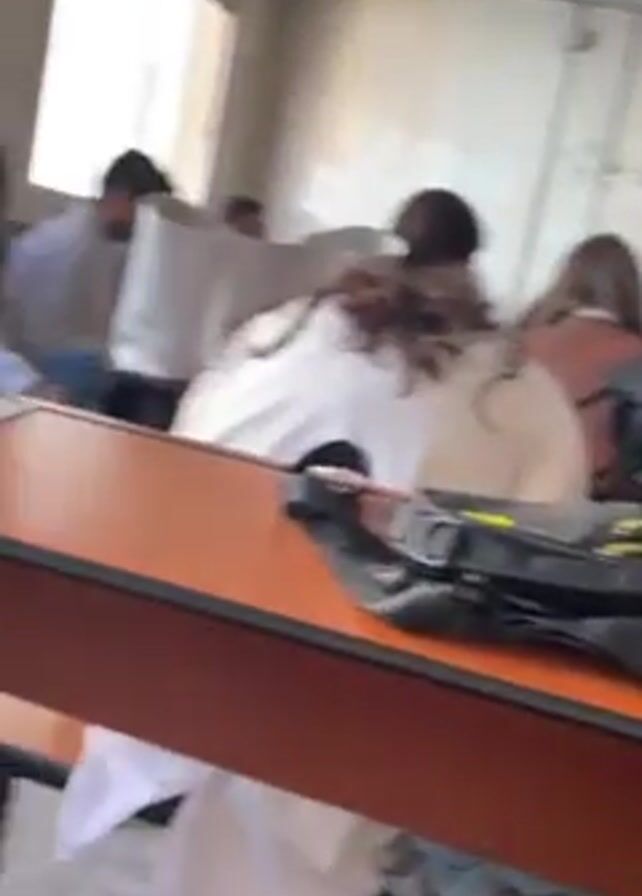 classroom setting with students seated at desks. Some students are wearing white coats, suggesting a medical or scientific context. The classroom has standard desks with orange tops and black metal frames. A whiteboard is visible in the background, though its contents are not clear. The students are interacting with each other, with some turning around to talk. The lighting is bright, possibly from overhead fluorescent fixtures. The camera seems to be positioned at a desk, giving a student's-eye view of the room.