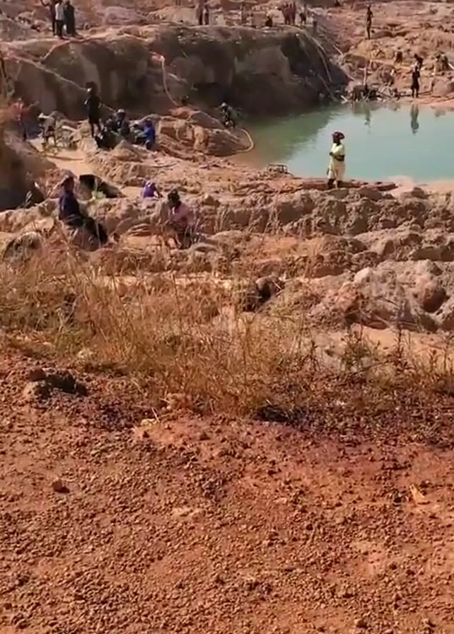 n open-pit mining operation with many people present. The ground is a reddish-brown color, and the terrain is uneven and rocky, with several excavated areas. A body of water, possibly a pond or flooded pit, is visible. People are scattered around the site, some near the water and others working on the excavated areas. There are some structures and buildings visible in the background, suggesting the location is near a settlement. Pieces of plastic, trash, and piping can be seen strewn around the ground, possibly left from the operation. The sky is clear, and the lighting suggests it is daytime.