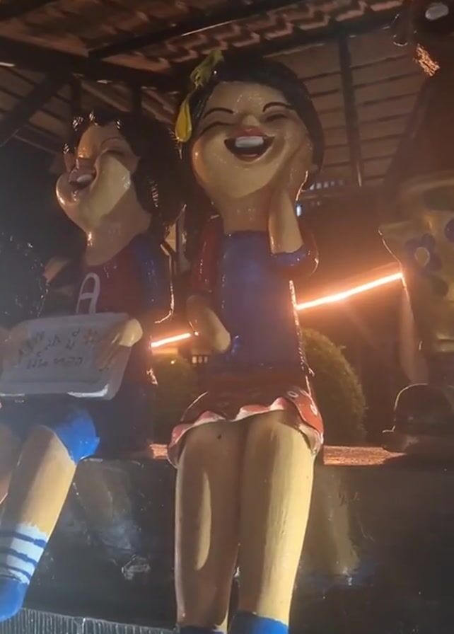 row of three painted ceramic or plaster figures sitting side by side, under an awning. They appear to be a fountain. The figures are caricatures of children, all smiling with exaggerated expressions. The figure in the center holds a white plaque with writing on it. The figures are illuminated by warm-toned lights from behind them. Rain or water flows over the figures.