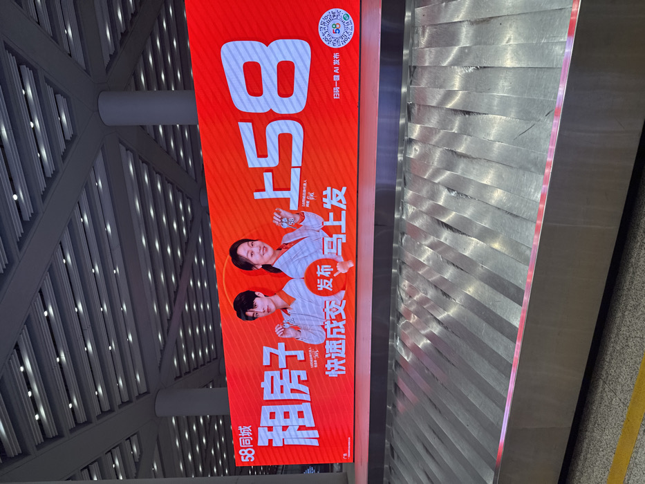 The image depicts an indoor scene within a baggage claim area at Beijing Capital International Airport, Shunyi District, China. A large, rectangular LED screen, prominently positioned, displays an advertisement for "58同城" (58.com). The advertisement features a young man and a young woman, both smiling and holding up small house keys adorned with the "58" logo. Chinese characters on the screen include "租房子 上58" (Rent a house, go to 58), "快速成交" (Quick transaction), "发布" (Post), and "马上发" (Get it right away/soon), along with a QR code for "AI 发布" (AI posting). Below the LED screen, an empty, stainless steel baggage carousel occupies the mid-ground, its ribbed surface reflecting light. The overhead environment consists of a high, structured ceiling with numerous small, recessed lights. The floor visible at the bottom of the frame is grey with a yellow demarcation line. No physical individuals are present on the baggage claim floor.