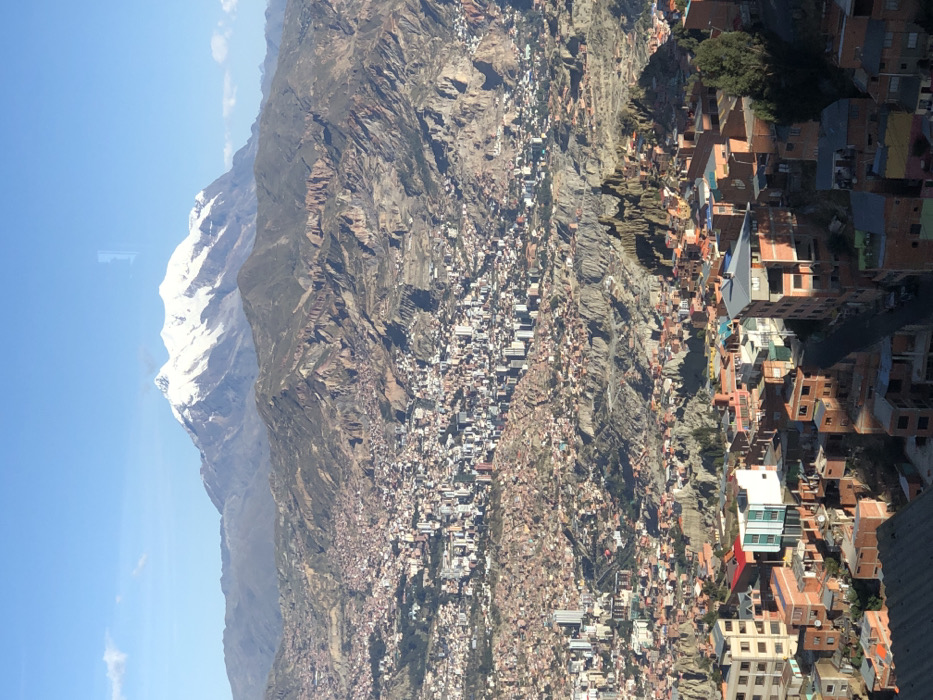 A sprawling city clings to steep, rocky terrain, ascending a mountain range