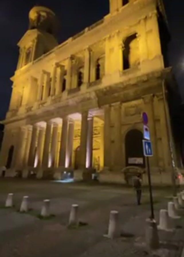 building illuminated at night. The building appears to be a church or similarly large religious structure with tall pillars, multiple windows, and two towers. A person is walking near the building on the right side of the frame. The area in front of the building is paved with cobblestones and is lined with short, white cylindrical posts. The sky is dark. The building is lit with bright yellow lights. There is a signpost with a pedestrian crossing symbol and a no parking symbol.