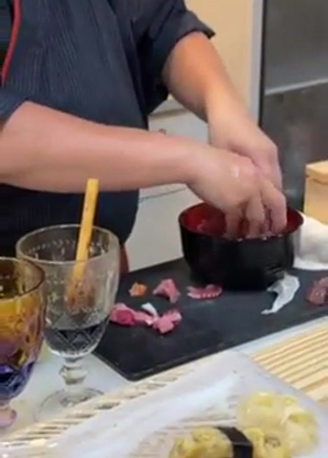 sushi chef preparing food behind a wooden sushi bar. The chef is wearing a black chef's hat, glasses, and a black and gray uniform. He is working on a black cutting board with small pieces of raw fish. He is using his hands to mix the fish with ingredients in a black and red bowl. In front of him is a clear plate with a piece of sushi and some pickled ginger. There are also two glasses with straws in them and a few other small dishes on the bar. Behind the bar, there are some cabinets and shelves with bottles. The video is shot from a close-up perspective, with a slightly tilted angle. The lighting is bright and even.