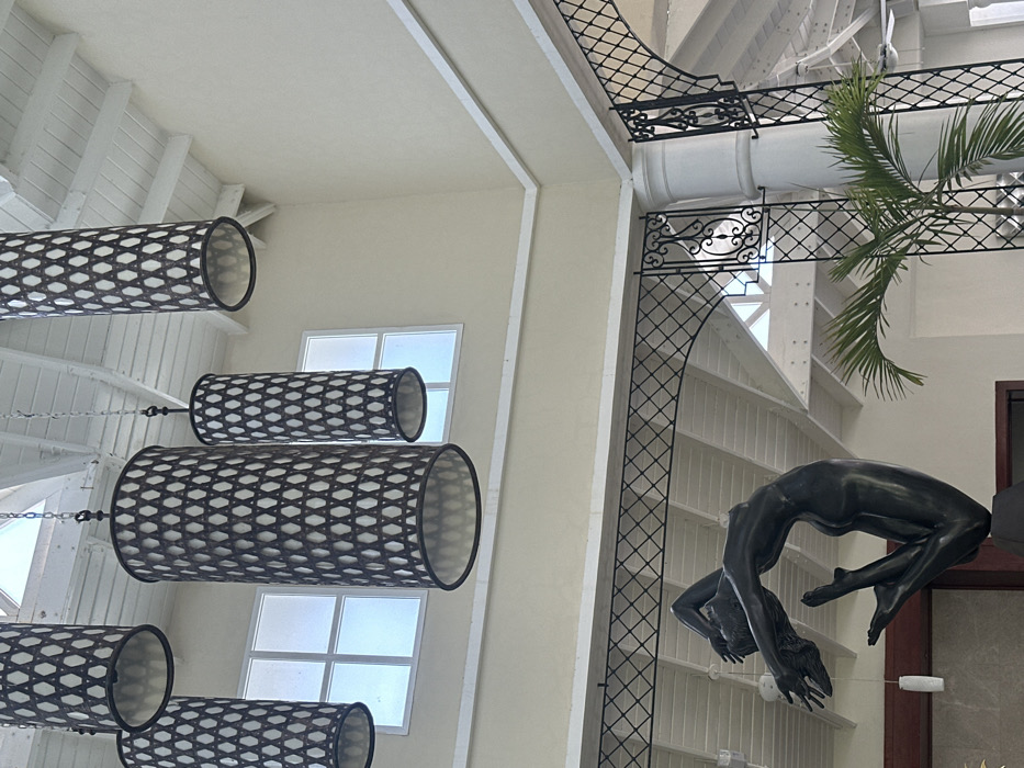 sculpture of a woman in a contorted position, inside an open-air building in Punta Cana, Dominican Republic, at the coordinates 18.723 latitude and -68.465 longitude. The sculpture is made of a dark-colored material, possibly bronze. The woman’s arms are raised above her head and her legs are bent at the knees. The sculpture is standing on a pedestal, located in the center of the image. The building is designed with white walls, a wooden beamed ceiling, and white pillars. There are four hanging, rectangular, lattice-style lamps in the building. The building has a large open section with a lattice-style window and a palm tree. The building is a large, open space with a high ceiling. The image was taken from a slightly elevated angle, looking down at the sculpture.