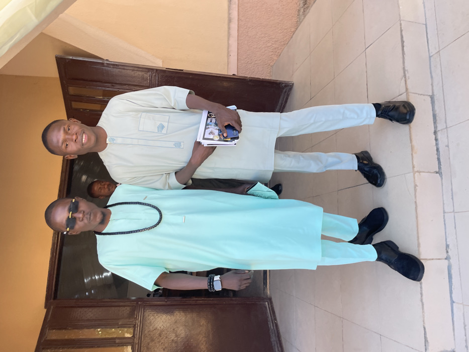 The image displays two adult males posing outdoors in front of a building entrance in Jos, Nigeria, under bright natural light