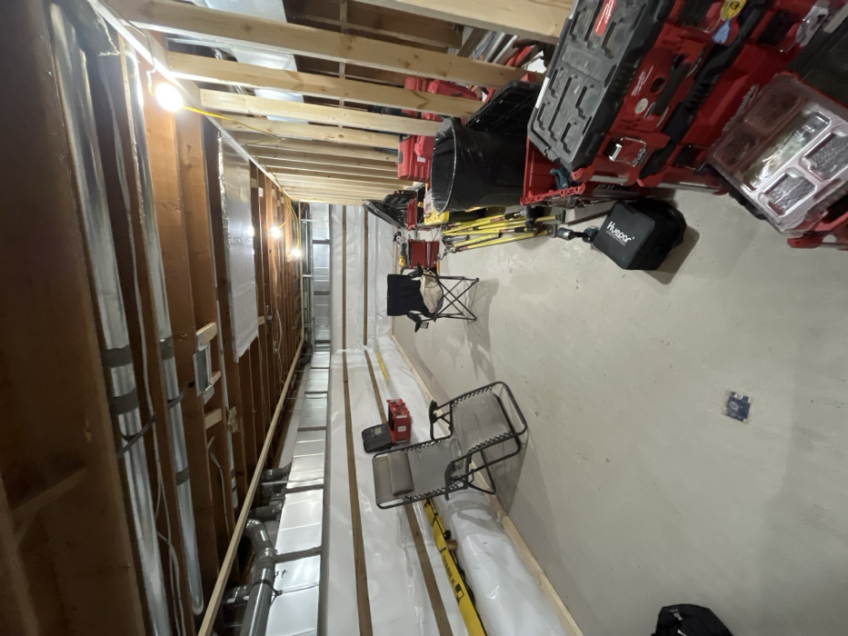 An indoor space under construction is visible, featuring exposed wooden beams and studs along the walls. One wall is lined with insulation covered in plastic sheeting. Scattered throughout the room are construction materials, including toolboxes and bags. A couple of folding chairs are positioned on the floor. Overhead, temporary lighting illuminates the scene.