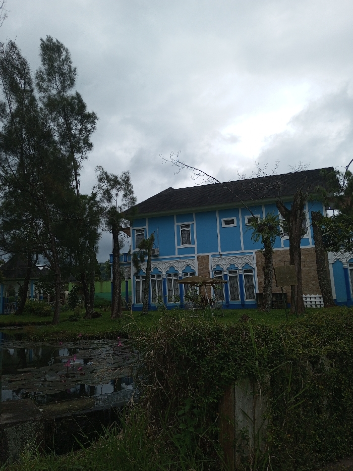 A two-story blue building with white trim and a dark roof stands behind a body of water covered with lily pads. Tall, thin trees stand on the left and right of the building. Lush green vegetation obscures the foreground. The sky is overcast and gray.