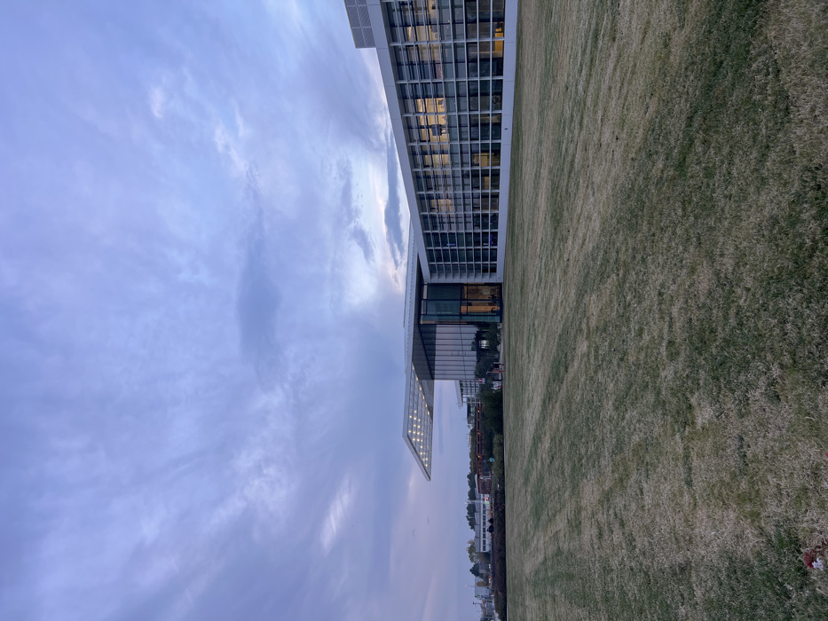 The image displays the modern architectural complex of the Philip Morris Manufacturing & Technology Bologna facility, located in Crespellano, within the city of Valsamoggia, Italy. The scene is captured during twilight, indicated by the soft blue, grey, and purple tones of the partly cloudy sky and the activated interior and exterior lighting of the building. The foreground consists of a large expanse of mowed lawn, showing distinct stripe patterns and varying shades of green and drier, lighter grass. A small cluster of reddish-pink foliage is present in the lower-left corner. The central subject is a contemporary multi-story building featuring extensive glass facades framed by white horizontal and vertical elements. A prominent, flat, white canopy, illuminated from its underside, projects significantly from the building's left side, covering an entrance area. Warm yellow and orange interior lights are visible through the large glass windows, reflecting portions of the twilight sky. Faint, indistinct human figures are discernible near the main entrance beneath the canopy. The building's right side extends with numerous grid-patterned windows. Behind a strip of dark shrubbery separating the lawn from the building, distant industrial structures and sparse vegetation are visible on the far left horizon under the dimming sky.