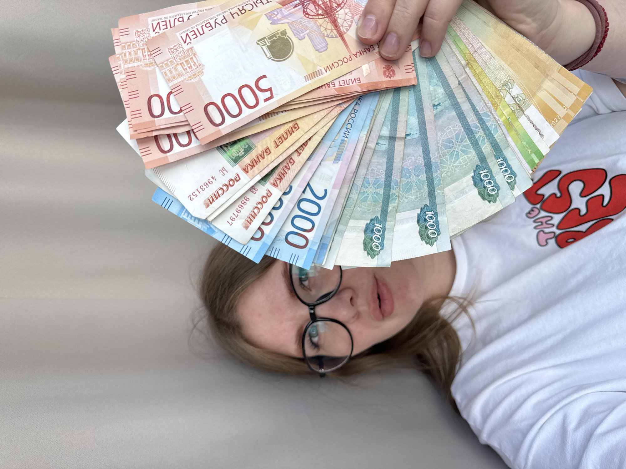 An indoor scene in Gornyi (Dvurechenskoe S/P), Russia, depicts a young adult female partially visible against a plain light gray background. She has light brown hair, wears black-rimmed glasses, and a white t-shirt with a partial red and pink graphic on the lower left. Two thin, dark red elastic bracelets are present on her right wrist. Her face is positioned towards the left of the frame, with her left eye visible and her lips slightly parted. Her right hand, centrally located, holds a fan of Russian Ruble banknotes. Visible denominations include 5000 Ruble (red-orange), 2000 Ruble (blue), and 1000 Ruble (green/teal) notes, all displaying "БИЛЕТ БАНКА РОССИИ".