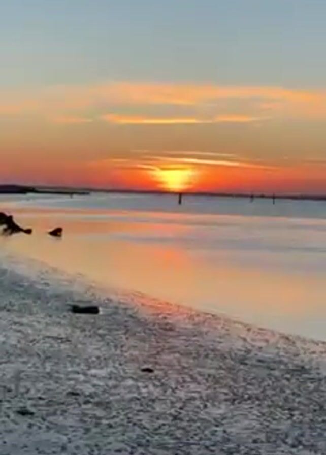 A sunrise over water is seen. The sky is a blend of blues, oranges, reds, and yellows. The sun is low on the horizon, appearing as a bright orange disk with dark lines of clouds above it. Its reflection shimmers on the surface of the calm water. Dark posts stick out of the water at intervals. The edge of a wet, sandy or muddy beach is visible in the foreground, dotted with small debris. The camera slowly pans upward, emphasizing the sky and the vibrant colors of the sunrise.