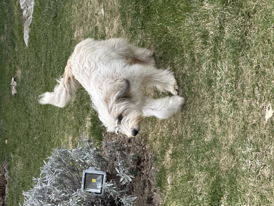 The image displays an outdoor scene in Romanii de Jos, Romania. A medium-sized, shaggy-haired dog with cream-colored fur and floppy ears is the central subject, walking towards the left. Its tail is elevated and appears in motion, curving upwards. The environment consists primarily of a grassy lawn with patches of sparser, drier grass and some exposed soil. In the left foreground, a silvery-green shrub is visible, at the base of which rests a square, white-cased LED floodlight. The ground immediately surrounding the shrub is barren soil. The overall lighting suggests daylight.