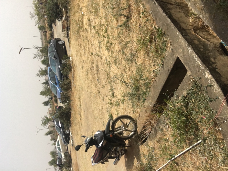 The image depicts an outdoor scene in Minna, Nigeria, under clear daylight conditions. In the immediate foreground, a black and silver motorcycle with a red-brown seat cover is parked on its stand on a patch of dry, yellowish-brown earth interspersed with sparse green weeds. A concrete drainage channel, partially overgrown with dry grass and small green plants, runs diagonally across the lower mid-ground. A white pipe or rod lies on the ground to the left of this channel. The mid-ground and background feature a parking area with an asphalt surface where at least six vehicles are parked. These include a white sedan, a black sedan, a blue SUV or hatchback, and another black sedan, among others. The parking area is bordered by sparse green bushes and small trees. Several tall, dark grey streetlights, each equipped with a solar panel, are visible within and around the parking zone. Multiple indistinct human figures are visible in the distant background, either walking or standing near the vehicles and further back towards what appear to be light-colored buildings. The overall environment is characterized by dry, light brown soil and sparse vegetation, consistent with a dry season, under a pale, hazy sky.