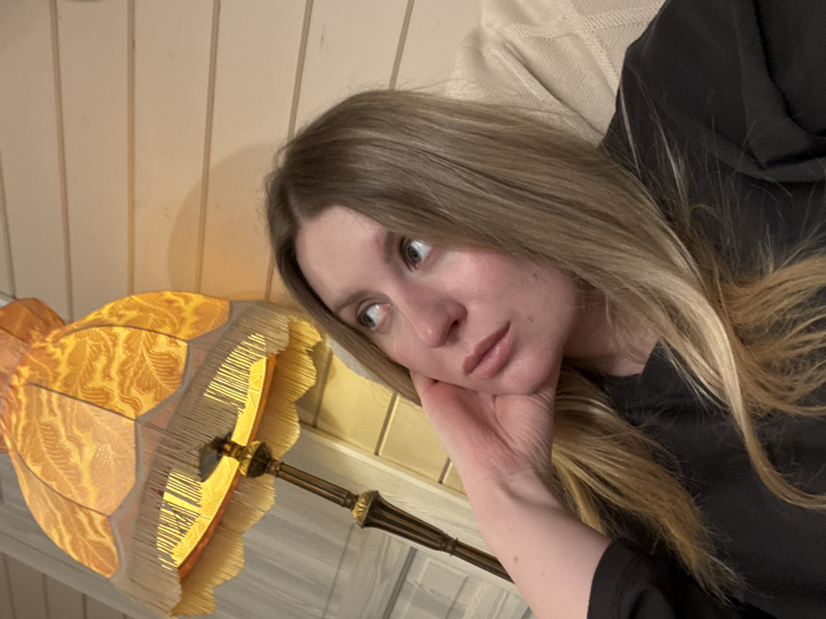 An indoor scene in Zelenogradskiy, Russia, depicts an adult female reclining. She has light brown to blonde hair, parted to her left, and wears a dark, long-sleeved top. Her left hand is positioned against her chin and jawline, and her gaze is directed upwards and slightly to the right of the frame, indicating a contemplative or thoughtful expression. To the left and behind her is an illuminated floor lamp featuring an ornate, frilled, yellow-orange lampshade with a visible pattern and a fringe along its lower edge. The lamp's dark-colored, decorative base is partially visible. The background consists of a light-colored, horizontally paneled wall. A portion of a light-colored, possibly cream or beige, upholstered surface is visible to the right, suggesting she is resting on a sofa or chair. The room is illuminated by artificial light from the lamp.