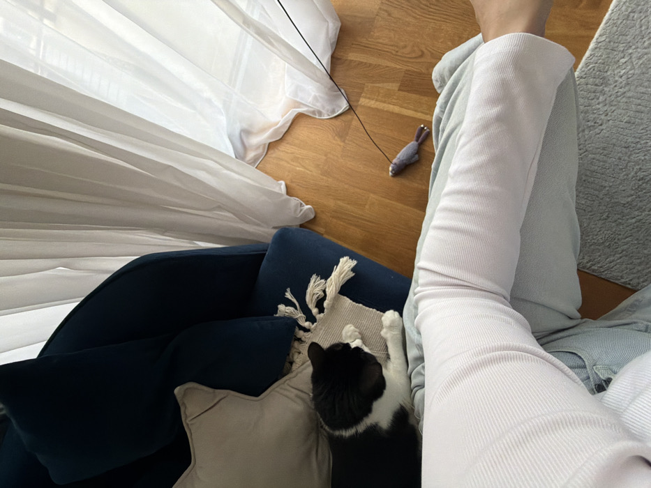 The image depicts an indoor residential scene in Belgrade, Serbia, viewed from a slightly elevated, downward-angled perspective. In the foreground, the lower body of a person is visible, clad in light-colored, ribbed leggings and covered by a light blue/grey blanket. A bare foot is discernible on the right edge. To the left of the person's legs, a black and white cat is resting on a dark blue upholstered sofa, with its front paws on a light-colored, tasseled throw or cushion. A light beige cushion is positioned behind the cat on the sofa. The background features a light wooden floor on the right, extending towards white, sheer curtains that hang from the top of the frame to the floor, indicating a window or glass door. On the wooden floor, near the person's foot and the curtains, lies a grey, mouse-shaped cat toy with a black string extending upwards out of view. A light grey textured rug or mat is partially visible in the lower center.
