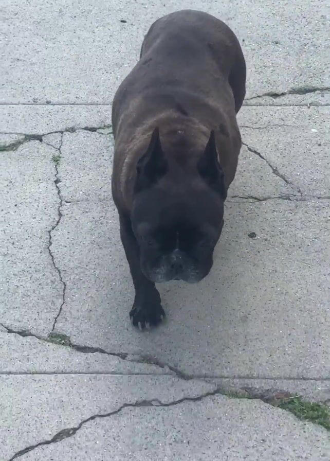 A dark brown French Bulldog walks on a concrete sidewalk. The dog's coat appears shiny in spots. The sidewalk is cracked in a few places. The dog walks slowly toward the left of the frame. The dog appears to have a black collar.