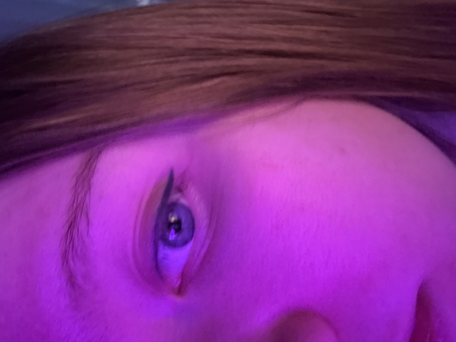 A close-up photographic depiction presents the left side of a human female's face. The scene is documented as occurring in Nizhnekamsk, Russia. **People:** One individual is present: a human female, visible from the left eyebrow to the upper lip area. The left eye is open and centrally positioned within the visible facial area, displaying a light-colored iris and a dark pupil. Black winged eyeliner is applied to the upper eyelid. The left eyebrow is discernible above the eye. A segment of the nose bridge is visible on the far left. Light brown or auburn hair falls vertically along the right side of the frame, obscuring part of the subject's right cheek. The skin exhibits texture, with a small, circular blemish or mole visible on the upper left cheek, approximately inferior and lateral to the left eye. **Objects:** No distinct objects are discernible within the frame other than the subject's physical features. **Actions/Interactions:** The subject's eye is open, suggesting an alert state, with the gaze appearing directed towards the camera or slightly beyond. No other actions or interactions are depicted. **Environment:** The scene is characterized by intense artificial purple or magenta lighting, which uniformly illuminates the visible portions of the face, imparting a strong monochromatic tint. Reflections of light sources are visible within the pupil of the left eye. The background is indistinct, appearing dark with subtle variations in purple and blue tones, consistent with an interior setting under controlled lighting conditions.