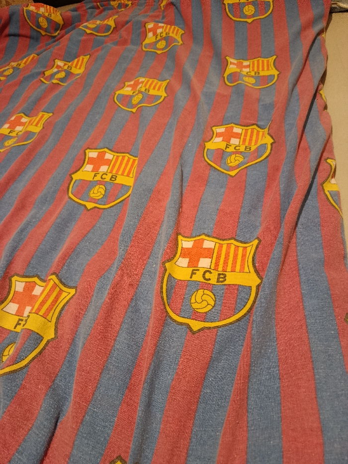 The image displays a close-up of a textile item, likely fabric for clothing or bedding. The fabric features a repeating pattern of alternating vertical stripes in faded red and light blue. Superimposed uniformly across this striped background are multiple emblems of FC Barcelona. Each emblem is a shield-shaped crest, predominantly yellow, containing the Saint George's Cross in its upper-left quadrant, red and yellow vertical stripes in its upper-right, and a football with the letters "FCB" written above it in its lower section. The fabric exhibits minor signs of wear and pilling. No people, specific actions, or discernible external environment are visible within the frame. The scene is located in the city of Sofia, Bulgaria.