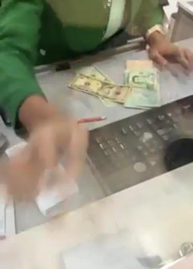 A woman wearing a green blazer and a KBank lanyard is standing behind a counter, handling US dollar bills
