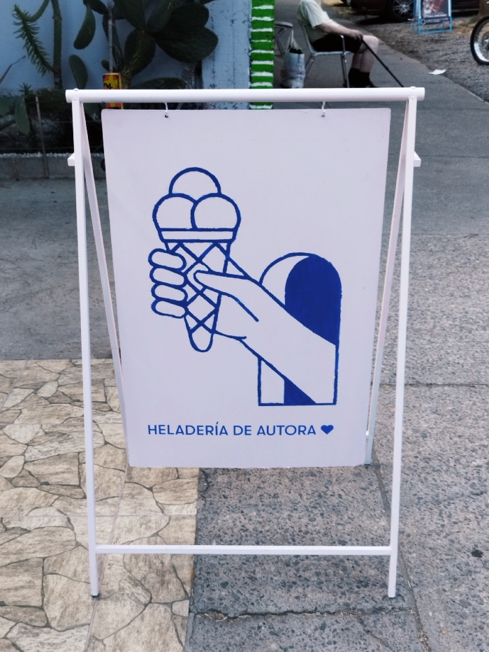 A white sandwich board sign features a blue graphic of a hand holding an ice cream cone. The cone contains three scoops of ice cream. The hand and ice cream are rendered in a simple, line-art style. Beneath the graphic, the text "HELADERÍA DE AUTORA" is printed in blue, followed by a small heart. The sign is mounted on a white metal frame and is placed on a sidewalk with a mix of stone and asphalt textures. A cactus and the legs of a person sitting on a chair can be seen in the background.