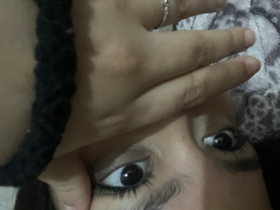 A close-up, slightly rotated view captures a person's face. One eye is prominent, with mascara-enhanced lashes and a dark pupil. Part of a hand covers the upper portion of the face, adorned with a ring. A dark, braided accessory is positioned on the left side. The background appears to be a soft, patterned surface.