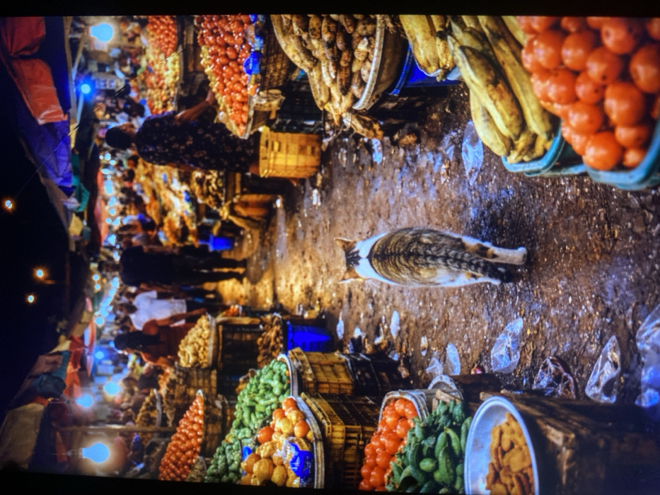 The image captures a nighttime market scene in Barakin Akawo, Nigeria. A domestic cat, exhibiting white, brown, and black tabby markings, walks away from the viewer down the center of a narrow, unpaved aisle. The ground surface is dark, uneven, and appears damp or muddy, with scattered plastic bags and refuse. Stalls line both sides of the aisle, densely packed with fresh produce under an overhead canopy structure. Artificial light emanates from numerous hanging bulbs, some displaying a prominent blue hue, illuminating the scene. On the left side, from foreground to background, commodities include a silver bowl filled with small, brownish food items, large quantities of green cucumbers, red tomatoes, green bell peppers, and yellow-orange citrus fruits, all arranged in woven baskets and brown plastic crates. Blue plastic buckets are visible beneath some displays. On the right side, from foreground to background, green bananas or plantains, red tomatoes, and large piles of yellow-brown produce, likely yams or plantains, are displayed in baskets and large bowls. A person wearing a dark, patterned dress stands behind a stall on the right, facing away from the camera, near a yellow plastic bucket. Several other individuals, including a man in a dark shirt and another in a light shirt, are visible in the mid-ground, walking through the market aisle. The background remains an active blur of additional stalls, people, and lights.