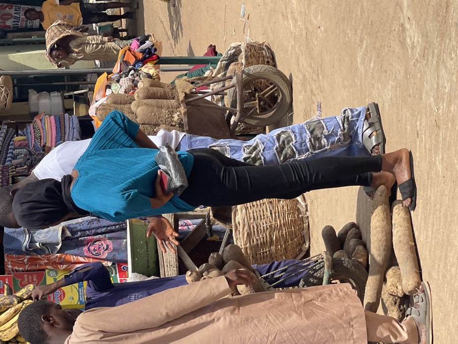 This image depicts a bustling outdoor market scene in Samaru, Nigeria, under bright sunlight