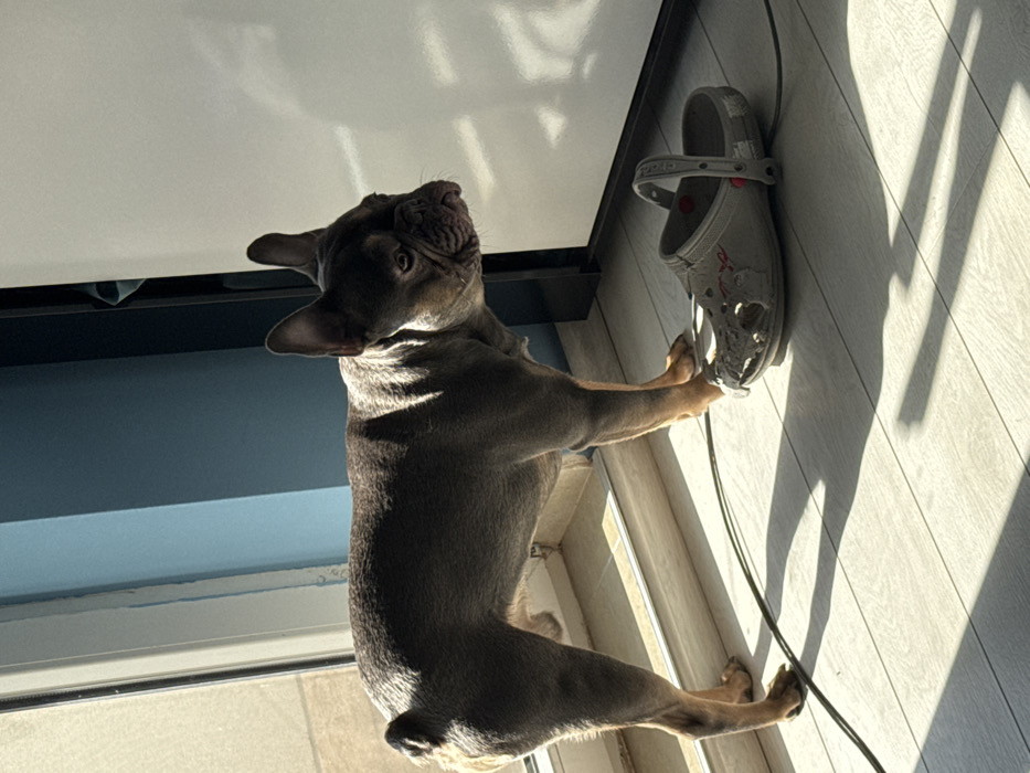 An interior room, identified as being in Burgas, Bulgaria, is depicted under strong natural light originating from the left. A French Bulldog, exhibiting a blue-gray coat with tan leg markings and erect ears, stands centrally, facing towards the right with its head slightly turned. Its short tail is visible. To the dog's immediate right and slightly forward, a single light grey Croc-style sandal rests on the light-colored wood laminate floor. The sandal shows visible damage, appearing chewed or abraded on its front surface and side, with red Jibbitz and a red heel strap button. A thin, dark cable is partially visible on the floor, running from the lower-left, under the dog's left front paw, and continuing behind the sandal. The background features a window or glass door frame on the left, a light blue wall section behind the dog, and a white vertical surface (possibly a door or cabinet) on the right. No human subjects are present.