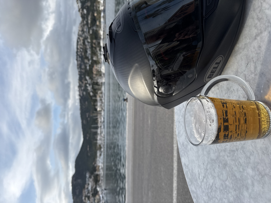 The image depicts an outdoor scene at Port d'Andratx, Mallorca, Spain. In the foreground, a clear glass mug containing an amber-colored liquid with a white frothy head, consistent with beer, rests on a light grey, circular table surface. To its right, a matte black full-face "BELL" motorcycle helmet with a dark tinted visor and a mounted accessory on its crown is also on the table. The background features a large body of water, a marina, filled with numerous moored yachts and boats. Across the water, a range of hills rise, densely covered with vegetation and numerous residential buildings. The sky above is partially overcast with white and grey clouds. No individuals are visible.