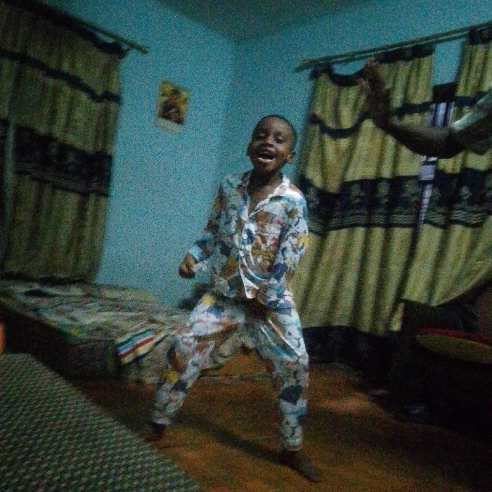 The image displays an indoor scene within a residence in Umuoji, Nigeria. A young child, barefoot and wearing a multicolored cartoon-patterned two-piece pajama set, stands centrally. The child's mouth is open, consistent with a wide smile or laughter, with arms slightly bent and legs spread in an active stance. A partial human arm is visible in the upper right quadrant, raised. The room features light blue walls, a bed with a patterned mattress cover along the left, and two drawn yellow-gold curtains with black horizontal patterns flanking the central subject. A small, indistinct item, possibly a picture or calendar, hangs on the wall between the curtains. The floor is light brown, and a patterned surface is partially visible in the lower-left foreground.