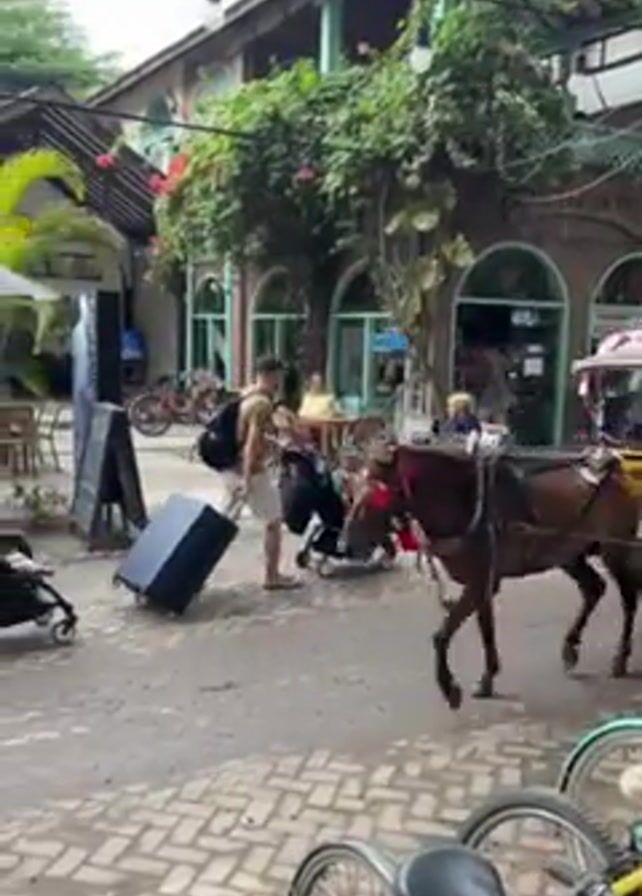 brick paved street in what appears to be a tourist area. A horse-drawn carriage trots down the street. A few people are walking around, including a person pulling luggage and pushing a stroller. Several bicycles are parked along the side of the street. In the background are buildings, trees, and what appears to be an outdoor cafe.
