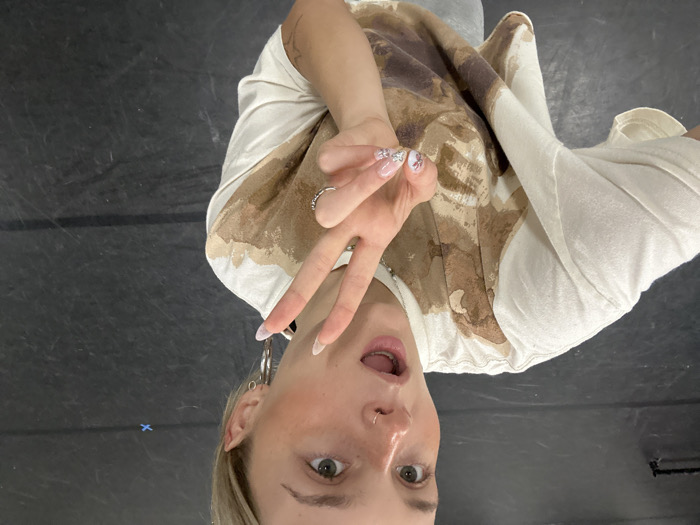 Located in Area D (Elaho/Garibaldi), Canada, a high-angle portrait captures a young adult female from the chest up. She has short blonde hair, light-colored eyes, a silver hoop nose ring in her left nostril, and multiple silver hoop earrings on her left ear. Her mouth is open, and she looks directly at the camera. She wears a white short-sleeved t-shirt with an abstract brown and beige pattern, and a light grey lower garment is visible. Her right hand is raised, forming a V-sign (peace sign) with the index and middle fingers extended. Her fingernails are long, coffin-shaped, with clear tips and floral/glitter designs. A silver-colored ring is present on her right ring finger. The background is a dark, scuffed floor or low wall, featuring a faint blue 'X' mark in the upper right quadrant and a dark horizontal line behind her left shoulder.