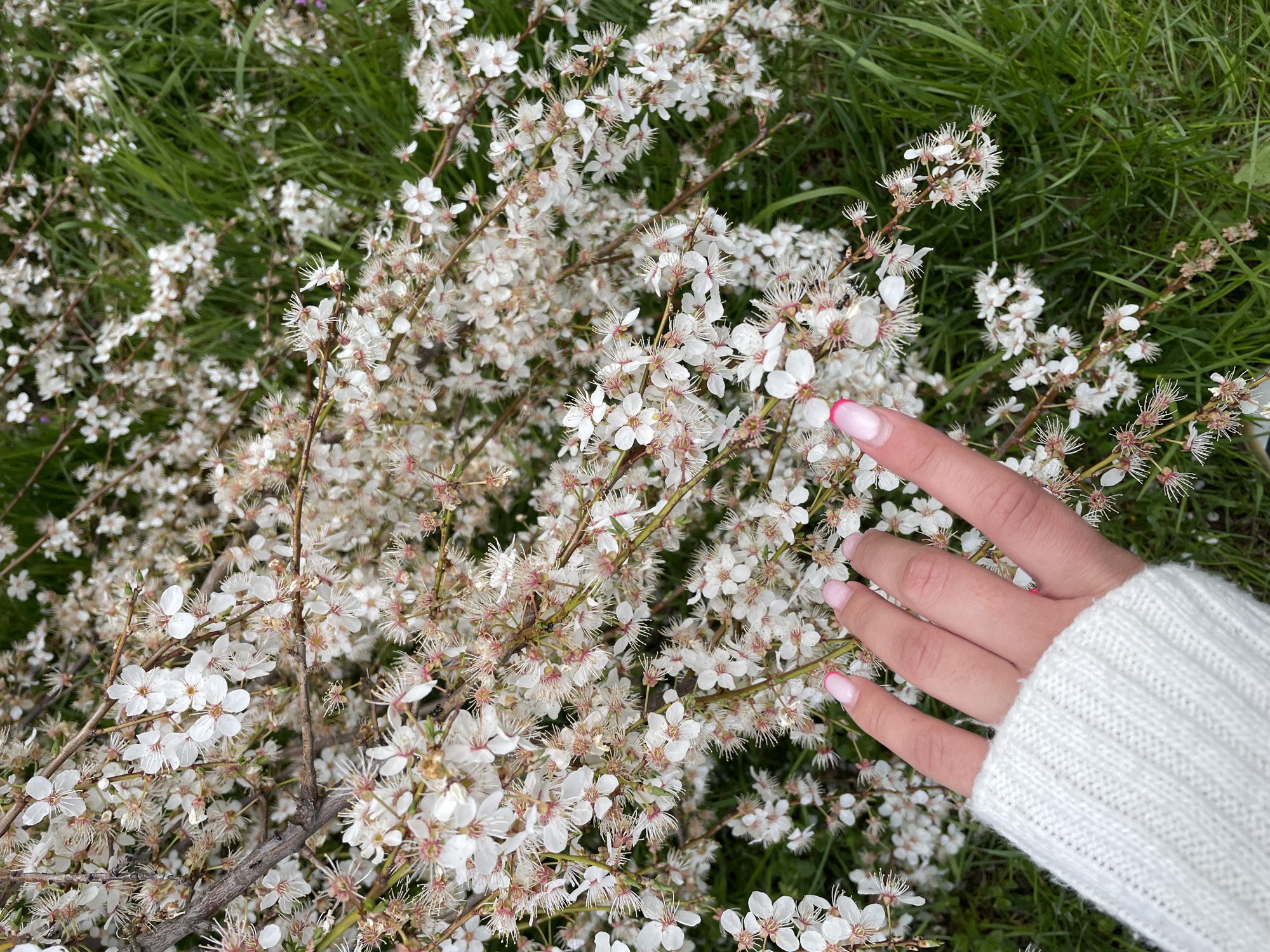 A medium shot captures a woman's hand in a white sweater, gently touching a cluster of white blossom flowers amidst green grass. The hand has a light complexion and manicured nails with a pink gradient. The flowers are small, white, and densely clustered on thin, brown branches. Green grass blades fill the background, suggesting a natural outdoor setting. No explicit location of Sadovets, Bulgaria is discernible from the visual information available in the image.