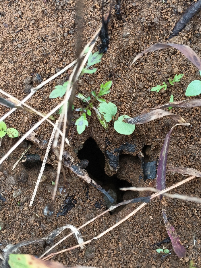 A close-up captures a burrow entrance in reddish-brown soil, surrounded by sparse vegetation. Young plants with green leaves, both lobed and round, are scattered around the opening. Dead, dried leaves and twigs are also present. The burrow's entrance is irregularly shaped and dark, contrasting with the lighter soil. Some twigs partially obscure the view of the hole and the ground.