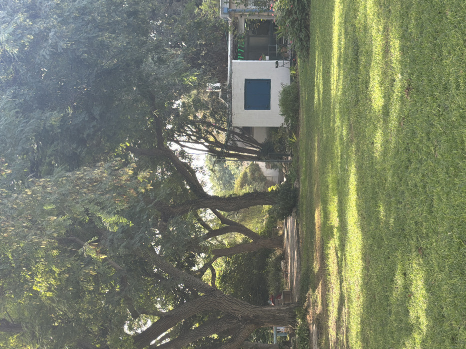 The image depicts an outdoor scene within the Sdot Negev Regional Council, Israel, characterized by lush greenery and a building. In the foreground, a well-maintained green lawn occupies the lower half of the frame, showing areas of sunlight and dappled shade. The midground is dominated by multiple mature trees with thick, gnarled trunks and dense green foliage, casting shadows. A light-colored path, possibly dirt or gravel, is visible beneath the trees on the left, with a small red object partially discernible nearby. In the background, to the right, stands a single-story white building with a flat roof. It features a prominent dark blue window shutter on its left side. To the right of the shutter, an outdoor seating area is visible with two dark chairs and a small table. Above this area, a sign with partially visible Hebrew text, "פנאי" (Pnai), is present. A metallic chimney or vent pipe extends from the building's roof. Additional trees and shrubs are visible behind and around the building, contributing to the verdant environment. No individuals are present in the scene. The lighting suggests a bright, sunny day.