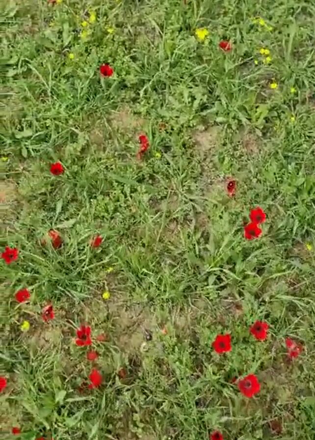 field of green grass sparsely populated with small red poppies and even smaller yellow wildflowers