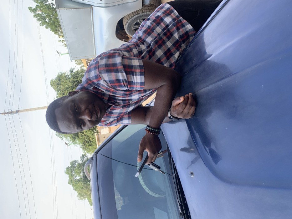 A man in a checkered shirt leans against the hood of a blue car. He holds a set of keys and a cell phone. The background includes greenery and utility poles. Part of a white vehicle is visible above the hood of the car. The man is looking at the camera with a slight smile. He is wearing bracelets and a wristwatch.