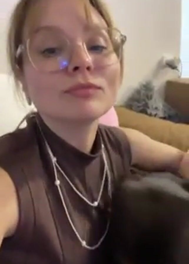 A person is holding a brown dog in their arms, facing the camera. The person is wearing glasses and a brown top, and has a double-strand pearl necklace. The dog is sticking its tongue out and has a silver collar. The person is smiling and talking, and the dog is wagging its tail. A man in a white shirt is partially visible in the background, sitting on a couch. The room has white walls, and there are electrical outlets and a light switch on the wall behind the person. The person moves around slightly, keeping the camera focused on themselves and the dog.
