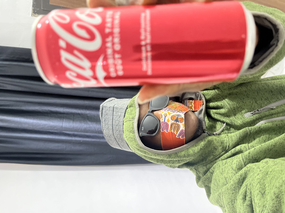 The image depicts a single individual indoors in the city of Joma, Ghana. The person, from the chest up, wears a light green hooded fleece jacket, a grey textured bucket hat, and black Ray-Ban sunglasses. A patterned orange, white, and yellow fabric face mask covers the lower half of their face, exposing a visible short beard or stubble beneath. The individual's right hand, mostly out of frame, holds a red Coca-Cola "Original Taste" aluminum can close to the camera, partially obscuring the person's face. The can is significantly out of focus, while the person's face is in focus. The background consists of a plain white wall on the left and dark grey/black curtains on the right.