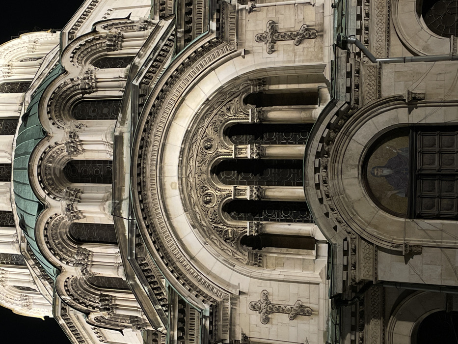 The image displays a detailed, night-time view of the upper and mid-sections of the St. Alexander Nevsky Cathedral in Sofia, Bulgaria. The structure is constructed from light-colored stone, illuminated against a dark, featureless sky. The upper visible section features green-patinated domes and roofs over light-colored stone drums, each adorned with rows of arched window openings framed by decorative columns and intricate carvings. Below these, a prominent tier of the facade includes multiple arched window recesses with dark glazing, separated by columns and capped by smaller green roof sections. Lower down the facade, a large central archway is visible, elaborately carved with decorative patterns and stylized human faces within medallions. Flanking this central archway on both sides are large, ornate Orthodox crosses carved in relief into the stone. At the bottom center, directly beneath the central arch, a dark, double-leaf wooden door is present, situated beneath a smaller arch. Within this smaller arch, a mosaic depicts a bearded, robed figure with arms partially raised, holding an object in the right hand. No individuals, actions, or interactions are depicted in the scene.