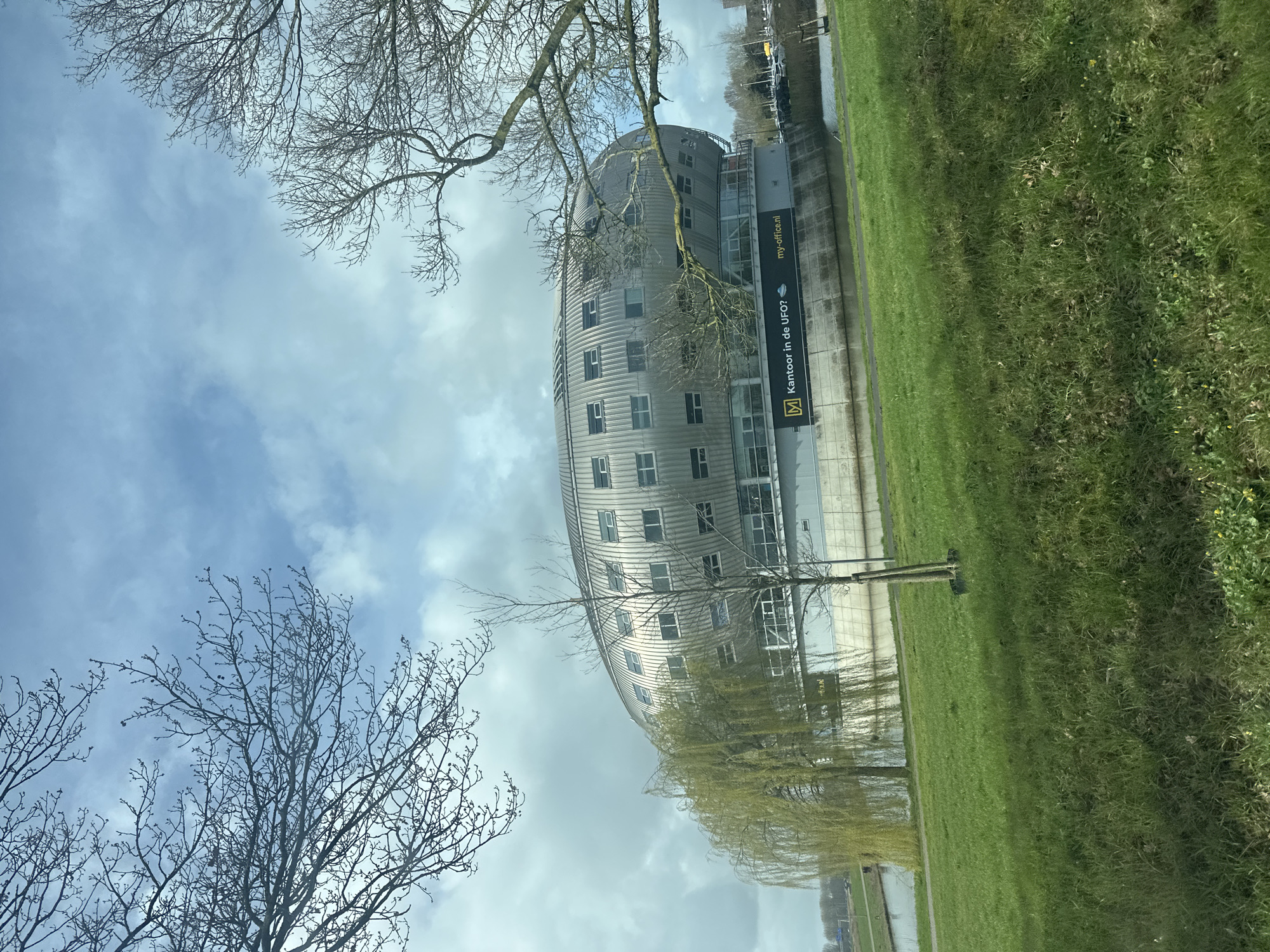 An exterior daylight image captures a distinctive, oval-shaped office building in Almere, Netherlands. The structure features a silver-grey, corrugated exterior cladding with rows of horizontally oriented, rectangular windows integrated into its curved upper sections. A lighter-colored, possibly concrete, base supports the building, displaying larger horizontal windows on its lower level. Two dark banners are affixed to the building's base; one reads "Kantoor in de UFO?" (Office in the UFO?) alongside a logo, while the other states "my-office.nl". The building is situated immediately behind a narrow body of water, consistent with a canal or ditch, which reflects the overcast sky. In the foreground, a vibrant green grassy embankment is visible, containing sparse patches of yellow wildflowers. Several bare deciduous trees, indicative of late winter or early spring, frame the top and right side of the image. A prominent weeping willow tree, displaying nascent green foliage, stands to the left, partially obscuring the building. In the background, beyond the building and water, a paved area with several parked vehicles and additional trees is discernible. The sky overhead is partially overcast with a mix of grey clouds and visible patches of pale blue. No individuals or specific activities are observed within the frame.