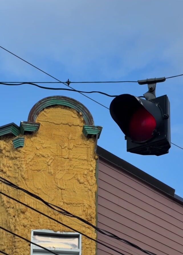 low-angle shot of a red traffic light hanging from wires in front of two adjacent buildings. The building on the left is yellow with a textured facade, a decorative arched top, and a window. The building on the right is brown with horizontal planks. There are numerous black wires crisscrossing the scene against a backdrop of a light blue sky with some clouds. The red light is illuminated.
