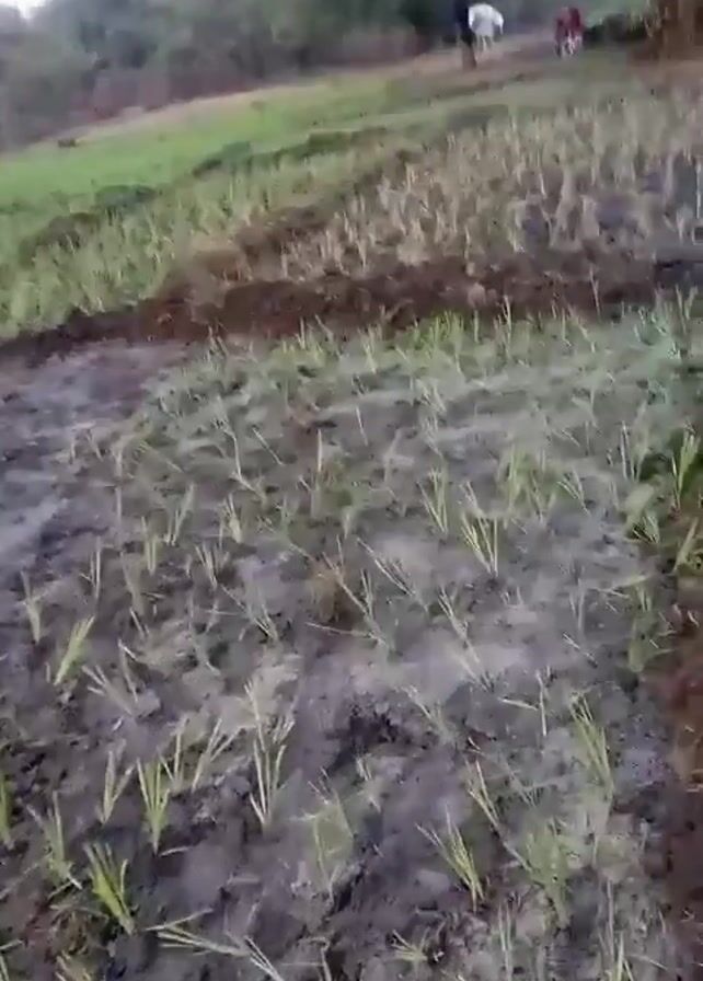 The video depicts a flooded field with young rice plants sparsely growing in rows. The ground is muddy and reflective, indicating recent rain or flooding. Patches of darker soil are visible, possibly showing areas where the soil has been recently turned or fertilized. In the background, there are trees and greenery, suggesting the field is located in a rural area. Further back, two people are working in the field, one appearing to be bent over tending to the crops, while another is near a motorcycle. The overall impression is of an agricultural scene focused on rice cultivation in a wet environment.