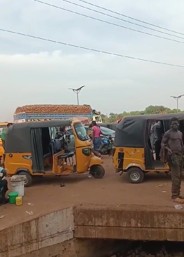 The scene shows three yellow auto rickshaws parked on a reddish dirt road in what appears to be a market area. The sky is overcast. A bare-chested man wearing camouflage pants stands near one of the rickshaws. Other individuals are visible around the rickshaws and in the background, which includes a truck loaded with goods and various market stalls. In the foreground, there is a concrete edge overlooking a ditch filled with trash. Power lines are visible overhead.