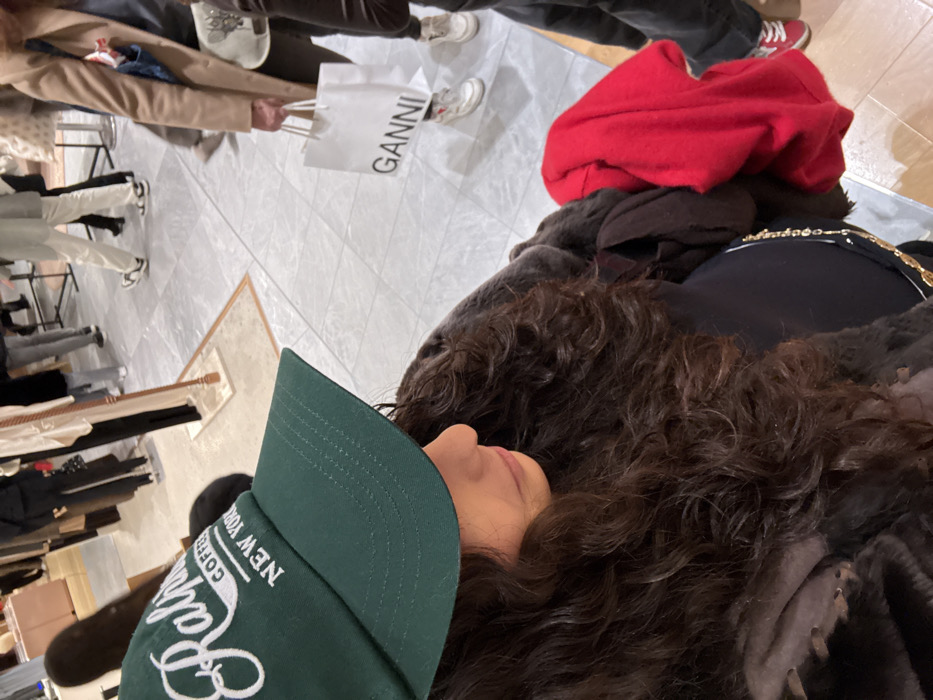 A low-angle shot captures a person wearing a green "Ralph's Coffee New York" baseball cap. The person is lying down, with a partial side view of their face visible. The background shows a store setting, including clothing racks, tiled flooring, and a "GANNI" shopping bag. Other shoppers are also seen, with a red garment draped nearby. The overall scene suggests a candid moment amidst a shopping environment.