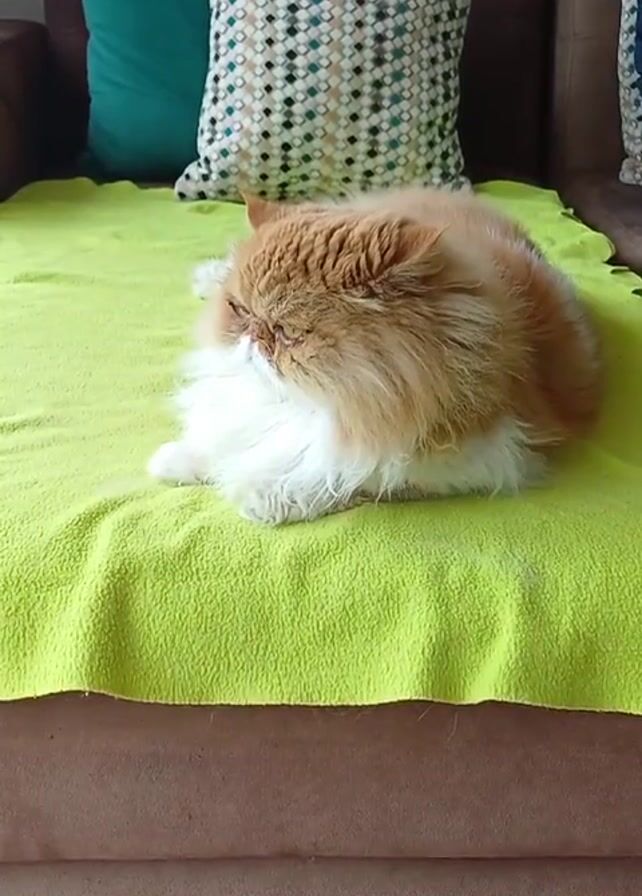 long-haired cat lying on a lime green blanket on a brown couch. The cat is mostly orange with some white fur. Behind the cat are two throw pillows, one teal and one with a pattern of circles. There is a muted conversation in the background.