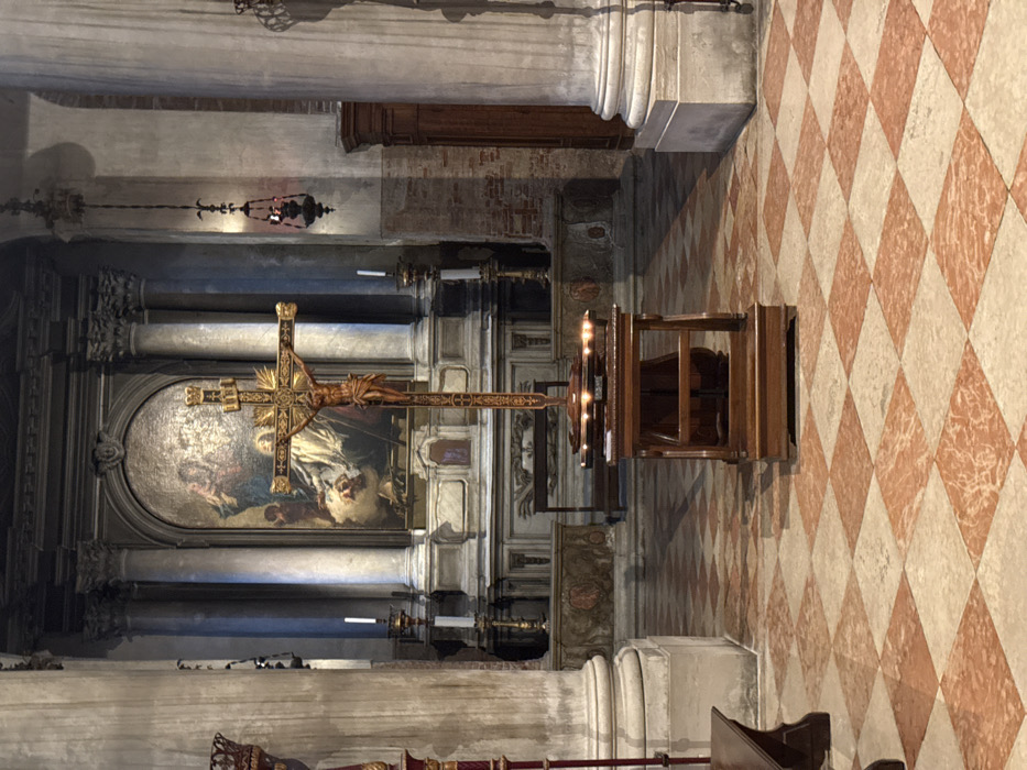 The image depicts the interior of the Church of Santo Stefano in Venice, Italy. The central focus is a large, ornate golden crucifix with a detailed corpus of Christ, positioned on a dark wooden prayer stand. Several small, lit candles rest on the top surface of the stand. Two taller candlesticks with unlit white candles flank the prayer stand. In the background, an elaborate altarpiece dominates, featuring a large oil painting depicting a religious scene, likely a Pietà or Lamentation over the Dead Christ, characterized by dramatic lighting and deep colors. This painting is framed by classical architectural elements, including fluted columns with Corinthian capitals, an entablature, and an ornate pediment. Below the painting, a classical altar table is visible. Large, fluted marble or stone columns with Corinthian capitals are present on both the left and right sides of the altarpiece, extending upwards. To the far left, a portion of a decorative candelabra or processional stand is visible. To the right, an ornate dark metal hanging lamp is suspended, and a tall, dark wooden cabinet or piece of furniture stands against a brick wall. The floor features a distinctive checkered pattern composed of light beige and reddish-brown marble tiles, arranged diagonally. No individuals are present in the scene. The lighting is moderate, contributing to a solemn atmosphere.