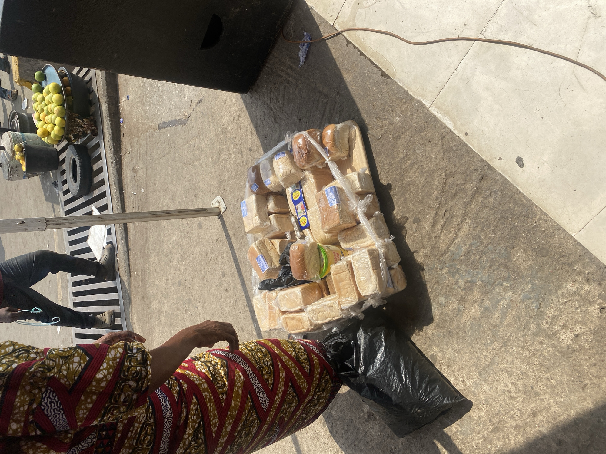 The scene depicts an outdoor street or market area in Ibadan, Nigeria, illuminated by bright daylight. In the foreground, a large stack of approximately 30-40 loaves of bread, each individually sealed in clear plastic, rests on a wooden board placed directly on the concrete pavement. The loaves are predominantly white bread, with some appearing darker, and several bear blue and white product labels. A black plastic bag sits on the ground to the left of the bread display. Partially visible on the far left, a person stands, clad in a patterned dress with red, yellow, and black geometric designs, facing away from the camera. In the midground, a dark metal grate covers a drainage channel. A thin, light-colored metal pole is anchored to the ground near the grate. To the immediate right, a large, dark, rectangular speaker box stands on the pavement, with a brown electrical cable extending from its base. In the background, behind the grate, a fruit vendor's display is visible. This includes a circular blue tray piled with numerous yellow and green citrus fruits, supported by a larger dark basin that also contains fruit. Several additional buckets, both dark and light-colored, hold more citrus fruits near the grate. A used vehicle tire rests on the grate. Further back, the lower legs and feet of another individual are visible, wearing dark trousers and shoes, holding a light-blue looped object. The concrete ground shows signs of wear and minor debris.